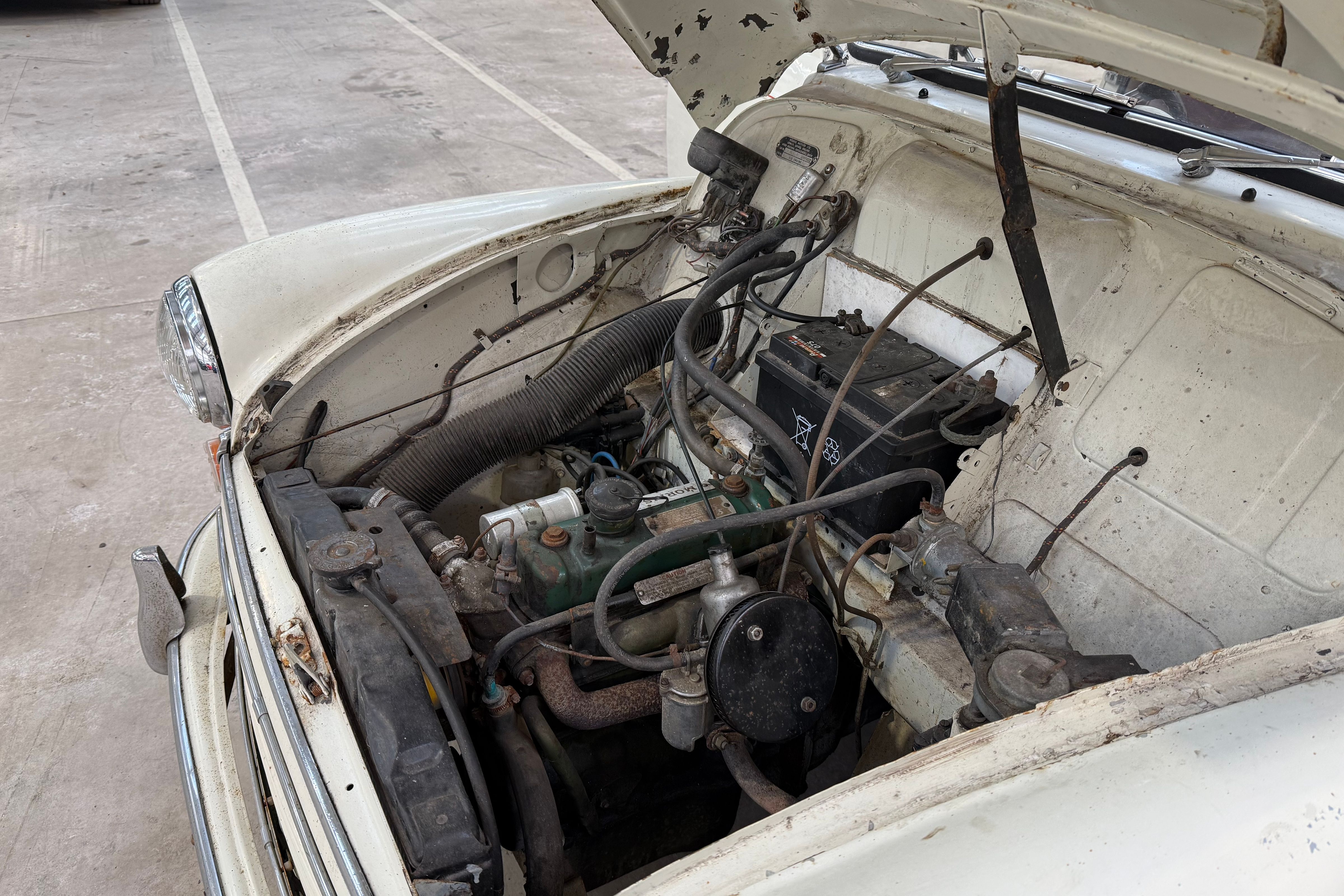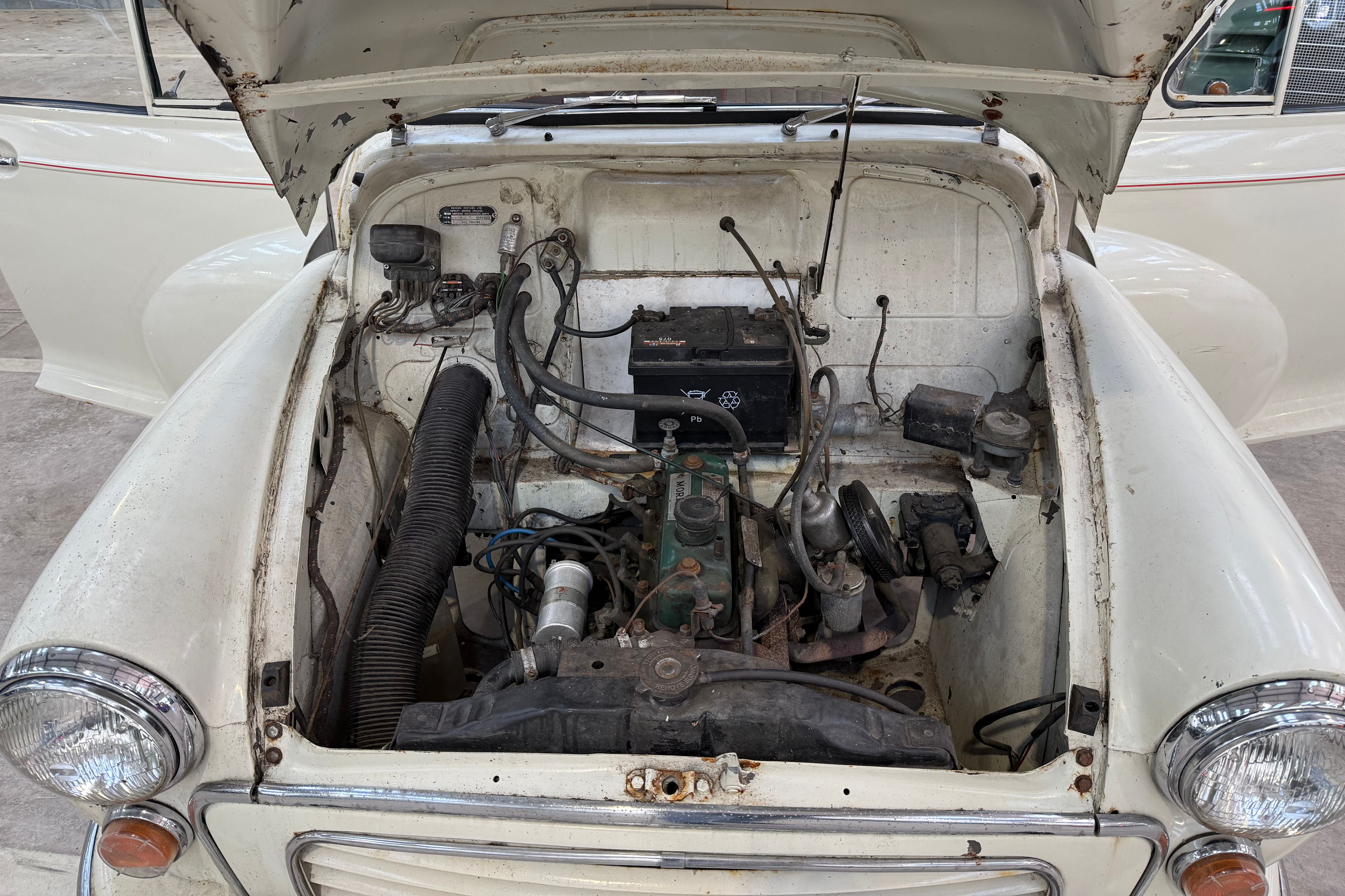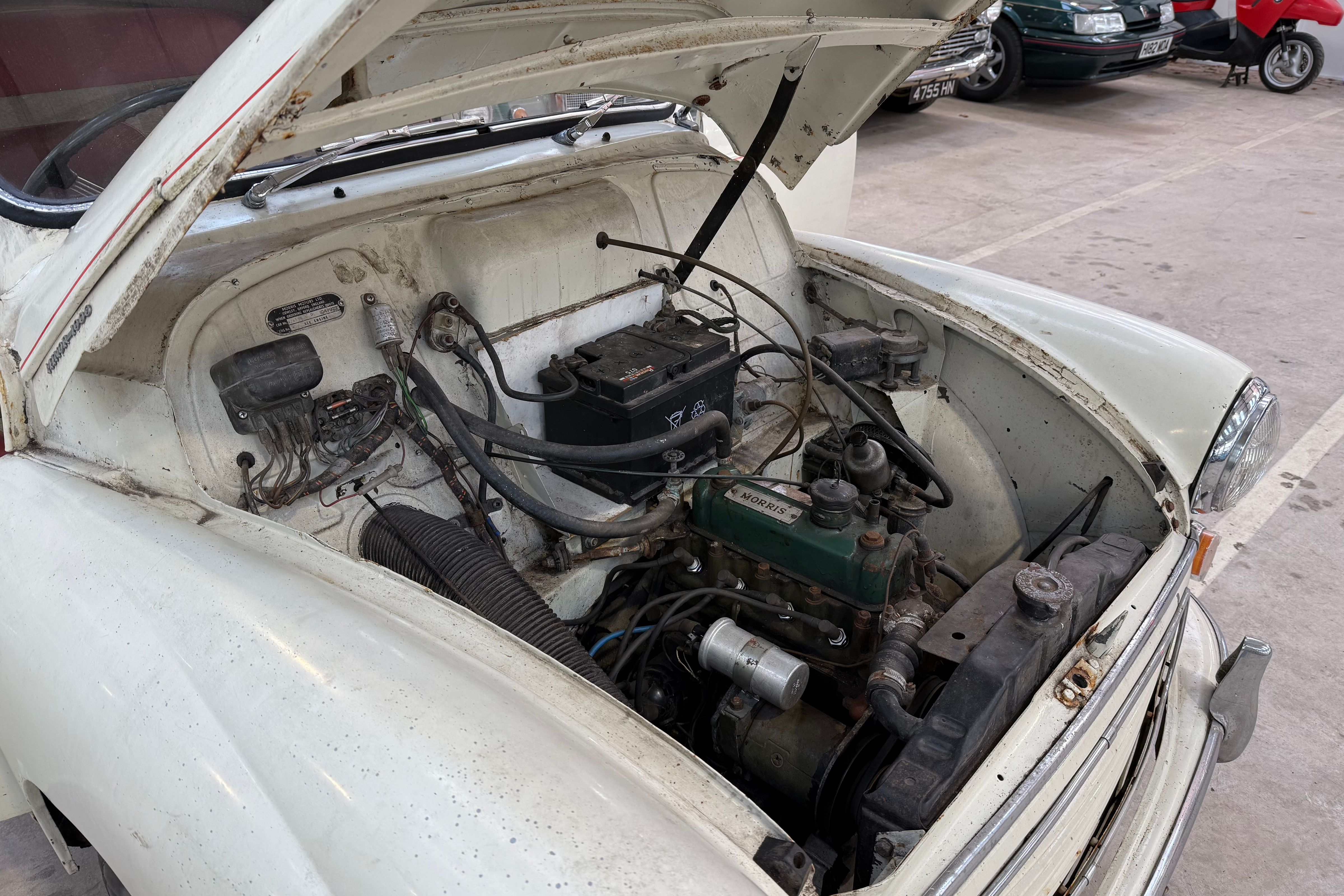 While specific historical records are not detailed, the car has clearly been laid up for an extended period, suggesting long-term storage rather than continuous use. Its survival in running order is a testament to the robustness of the Morris Minor platform.